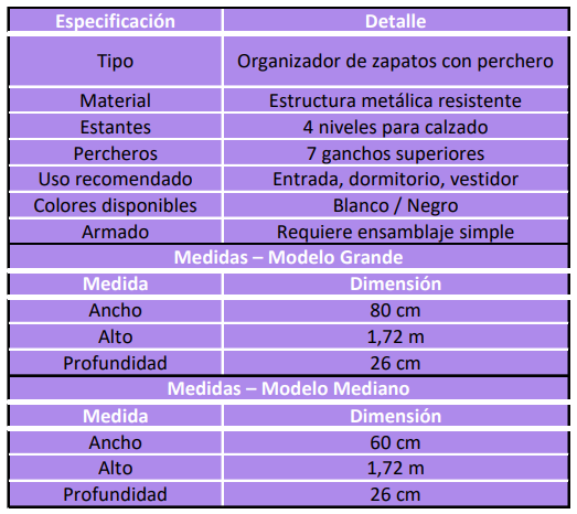 Su diseño metálico es firme, estable y fácil de limpiar, mientras que los estantes permiten organizar varios pares de calzado y los percheros sostener abrigos, bolsos o accesorios.