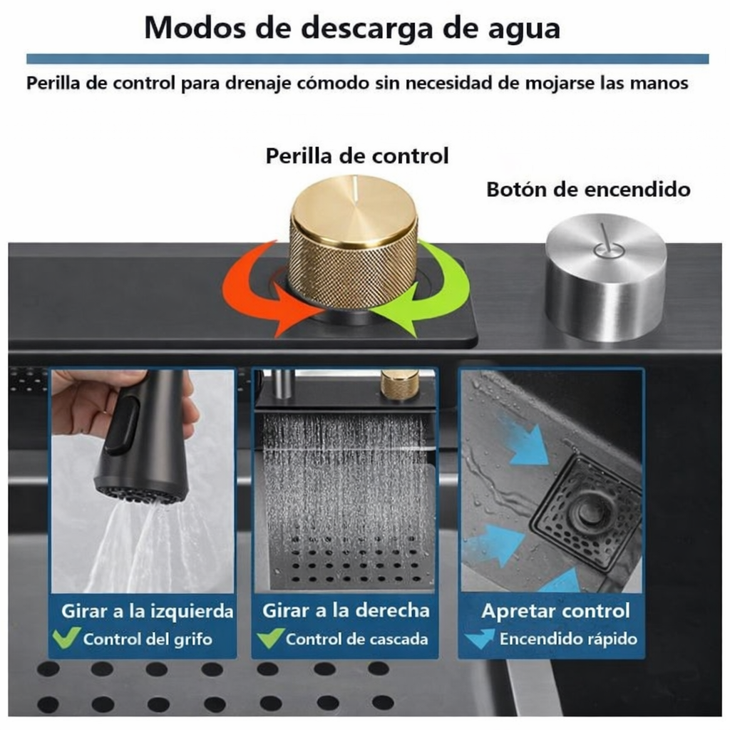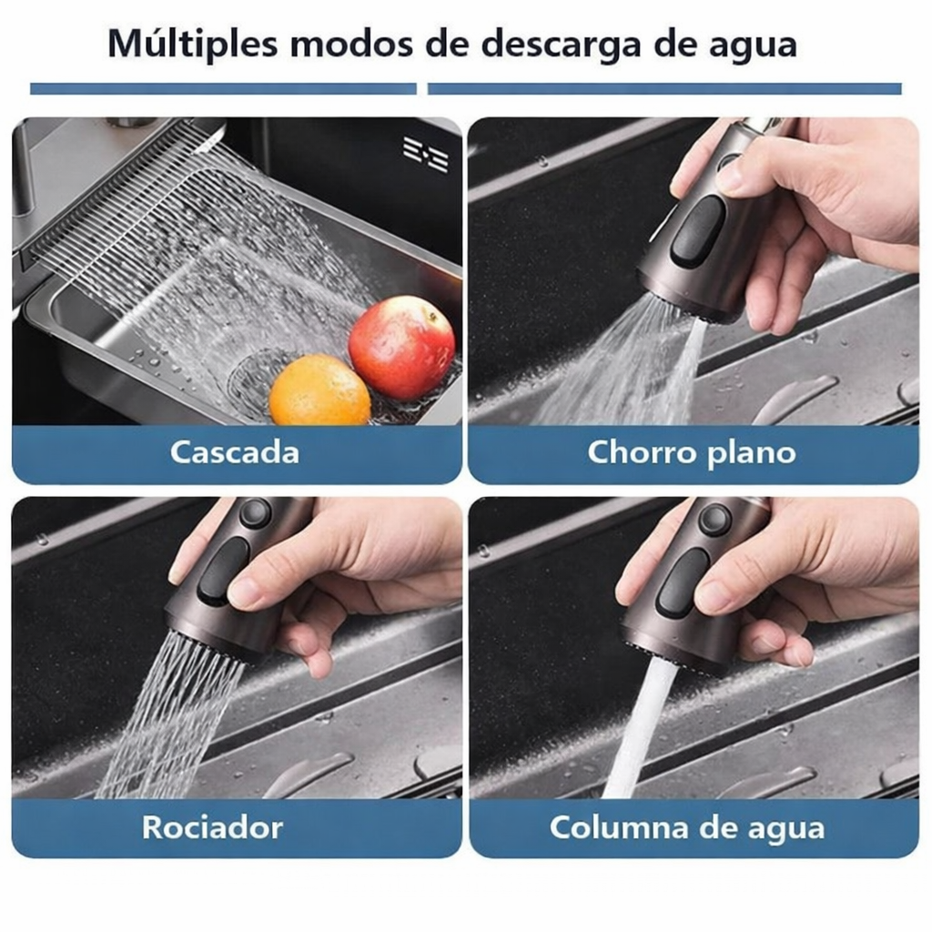 🚿 Grifería multifunción (4 modos de descarga)✔️ Cascada integrada en el borde.