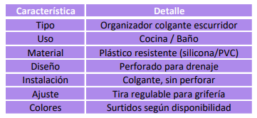 Se cuelga fácilmente en la grifería o borde del fregadero gracias a su tira ajustable, sin necesidad de adhesivos ni perforaciones.