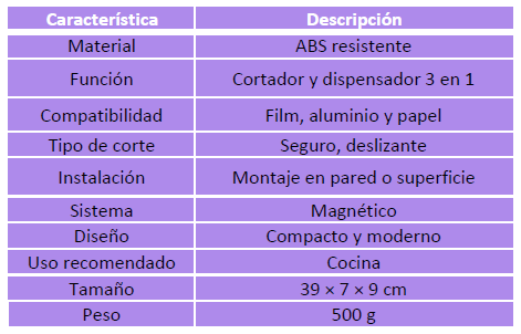 Este cortador de papel film 3 en 1 está diseñado para simplificar tu rutina en la cocina. Permite cortar film, aluminio y papel manteca de forma rápida, prolija y segura, evitando enredos, desperdicio y cortes desparejos.